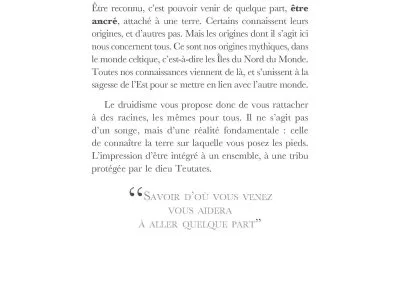 Notre éditeur a décidé de poursuivre l’aventure de LA PAROLE DU DRUIDE en collection de poche. Epanouissez-vous grâce à notre héritage celtique. A quoi servirait-il de connaître la tradition druidique, de maîtriser le savoir de nos ancêtres, de comprendre leur spiritualité si cela ne nous servait pas dans notre recherche quotidienne ? Je vous propose donc là un chemin de développement personnel basé sur la tradition et sur mon expérience de druide : ce livre a pour but de vous reconnecter avec les trois mondes des Celtes et ainsi de tendre vers un équilibre de vie. A travers cet ouvrage, je souhaite simplement vous transmettre ma réflexion pour alimenter votre quête.